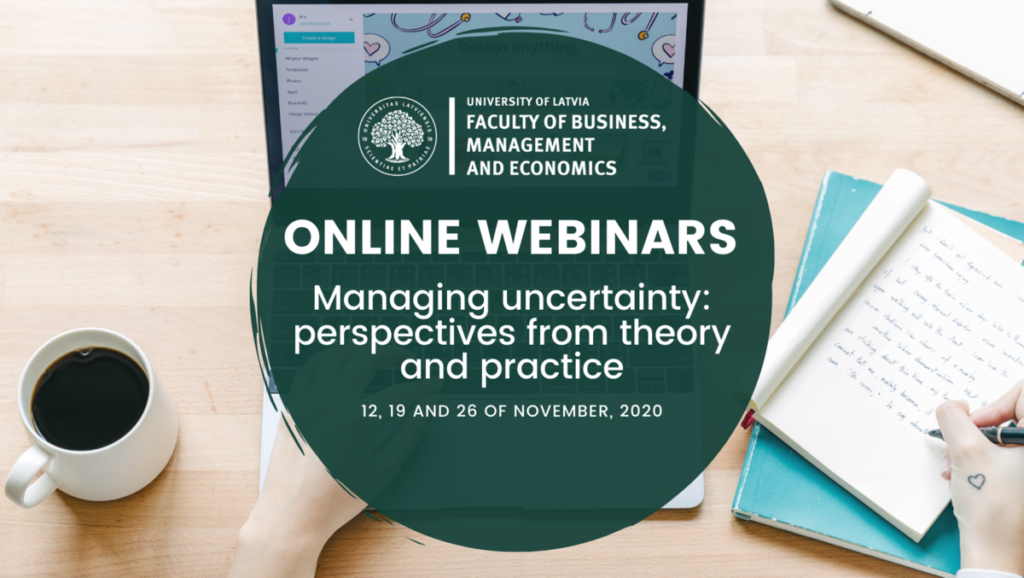 University of Latvia Faculty of Business, Managements and Economics Doctoral school invites you to participate in online webinars. The online webinars will take place November 12 and 19 from 11.00 till 12.30 at ZOOM platform and Facebook life stream. Webinars will be moderated by assoc. prof. Ilona Baumane-Vītoliņa.