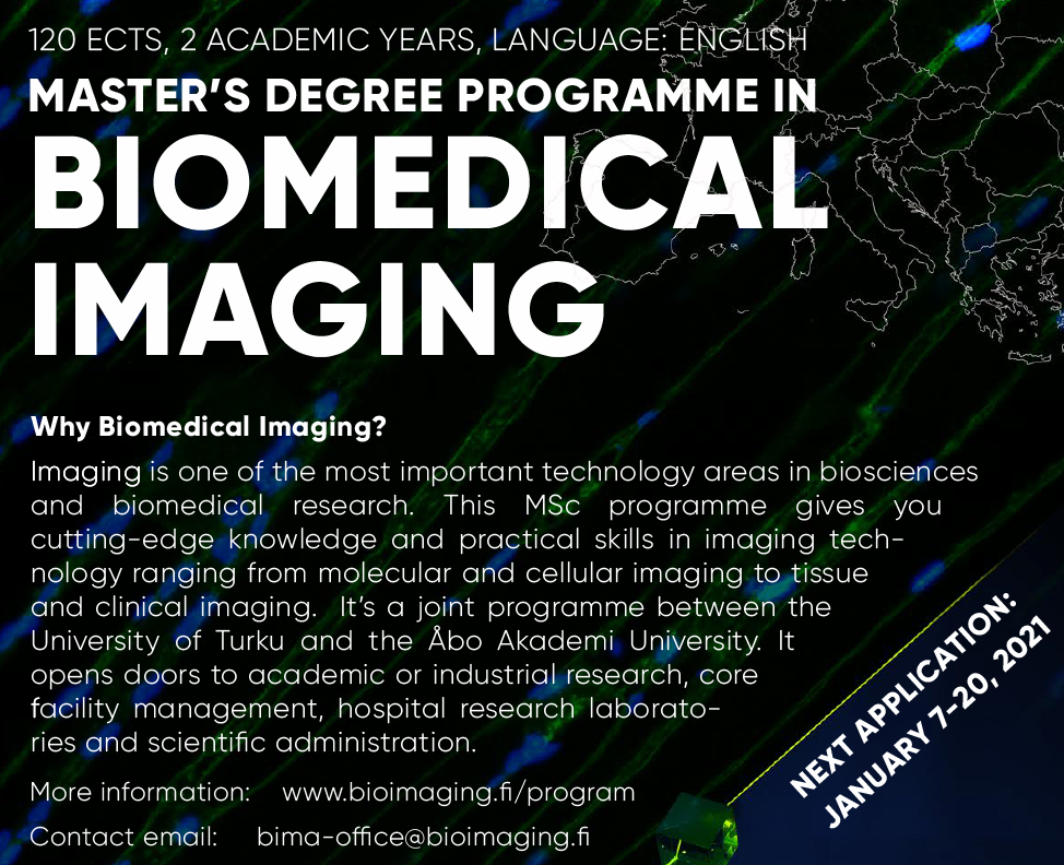 International Master´s Degree Programme in Biomedical Imaging in Turku, Finland – Call for applications for studies starting in August 2021 is opening on January 7th.